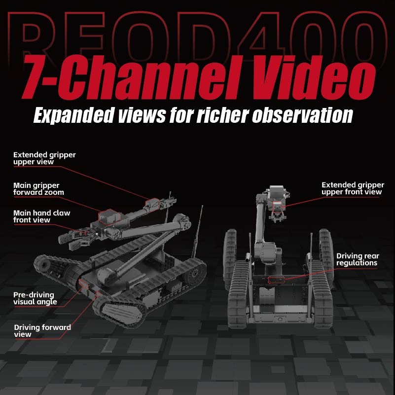 Equipped with an 8-degree-of-freedom Manipulator, the REOD400 offers precise control with a maximum gripping height of ≥1700mm (main claw) and a farthest grabbing distance of ≥1380mm (main claw). The robot supports a 7-channel video display, enabling richer observation perspectives, and features remote 3D posture real-time display capabilities. With a battery life of ≥2 hours at normal temperature, an IP66 rating for dust and water resistance, and control methods that include cable control up to 100m and wireless control up to 1000m, the REOD400 is built for reliability and versatility in challenging conditions. Additionally, it offers OEM and ODM customization options to meet specific operational needs.