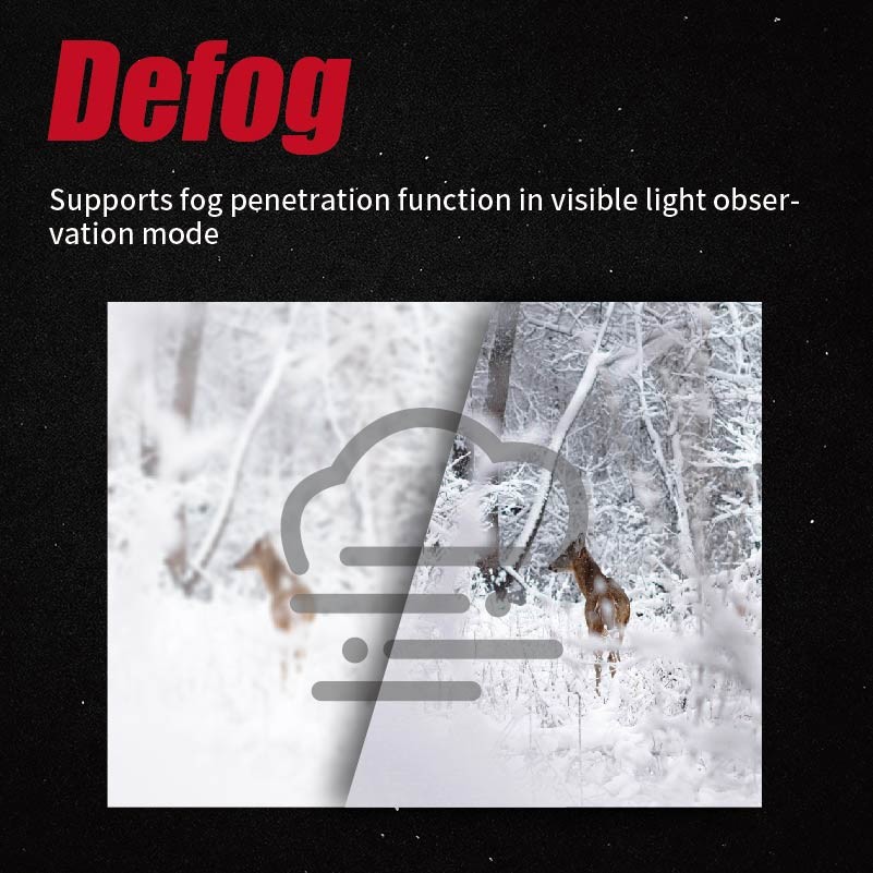 Includes a defog function in visible light observation mode, enhancing image clarity in foggy or misty environments. This feature effectively mitigates the impact of fog, ensuring targets remain visible and details are sharp, even in adverse weather conditions.
